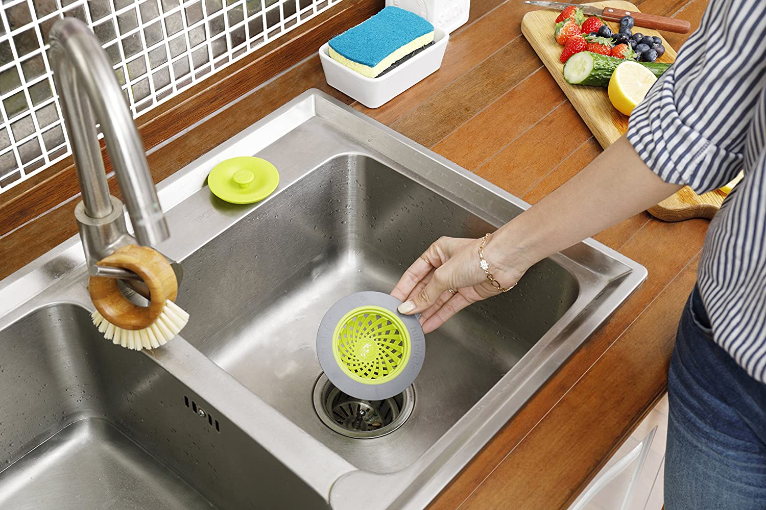 Putting a strain on your drain? Then do your sink a favor with this strainer and stopper. The stopper pops on top of the strainer when you need to fill your sink, and the strainer’s tab makes it easy to remove from the drain, even when the sink is full.