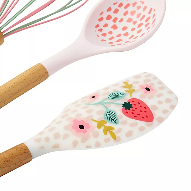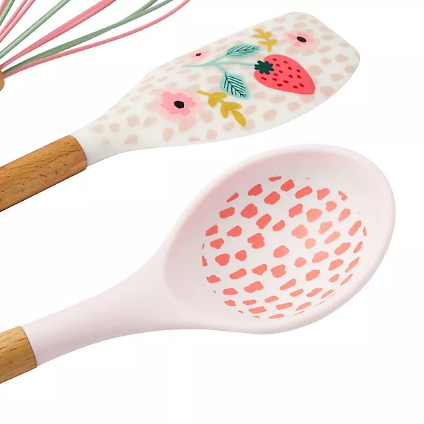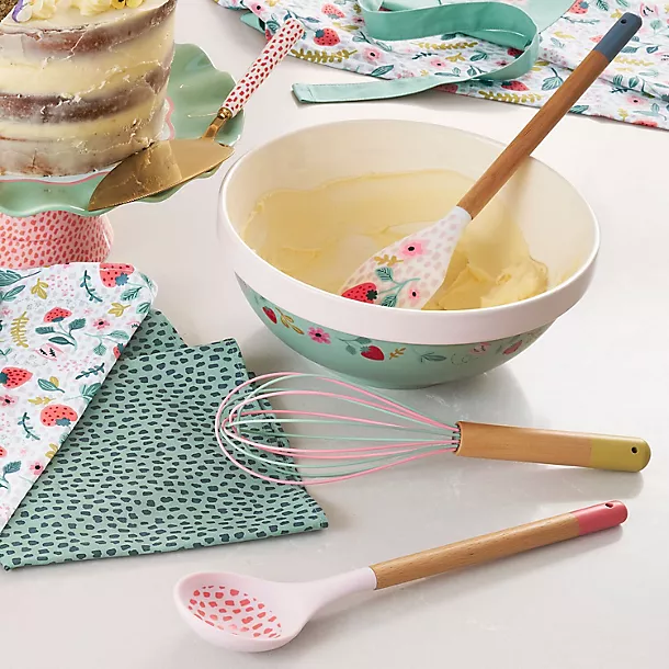 This delightful trio of silicone utensils are a great way to stir, scoop and whisk in style. Decorated with a playful pattern designed in-house, featuring illustrations of flowers, foliage and, of course, strawberries, this exclusive design is sure to brighten up your kitchen. The beautiful beech handles have coloured tips to easily distinguish them if they’re in a draw, and the handy hanging hole in the handle makes them easy to store and display.